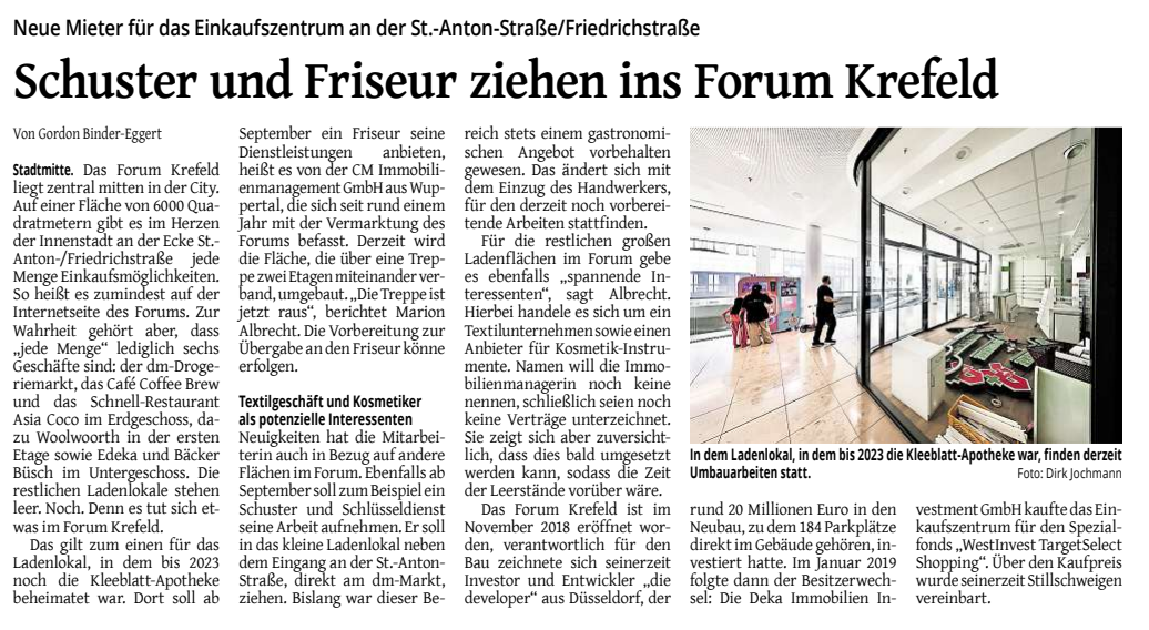 „Schuster und Friseur ziehen ins Forum Krefeld“ (Quelle: WZ 19.08.2025)